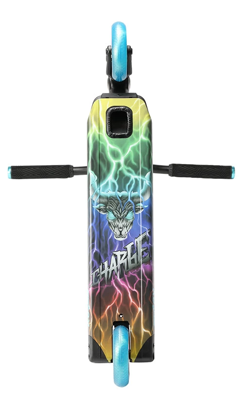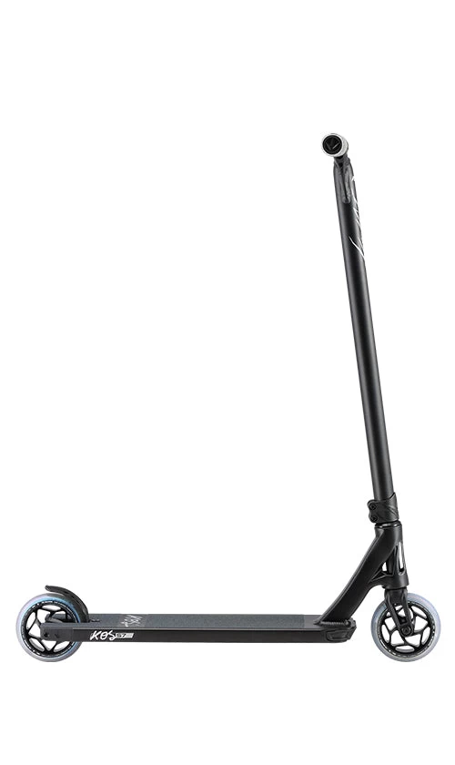 The NEW KOS Charge features include: Aluminium Bull Bars-light weight and durable construction with an aggressive look; Will Scott Signature Handgripsโextremely durable and offer the perfect grip for the scooter with added bar protection with the Halo bar ends; The original 2 bolt Forged clamp raised front profile adds ultimate style and lightweight protection for the Alu Charge Bar; Declare IHC compression Forks-a perfect fit for the 30mm wheels; 30mm wide Tri-Bearing wheels with Teal PU give a seriously smooth and responsive ride; AOSV4 X KOS 6061-t6 extruded Aluminium deck; and Integrated head tube at 82.5degrees. By utilizing the AOSv4 signature head tube combined with the KOS headtube cut-out, calls for one fine-looking deck profile. This ever-classic stunt scooter is finished off with Boxed ends, a nylon brake system, nylon front plate, and rear inserts.
