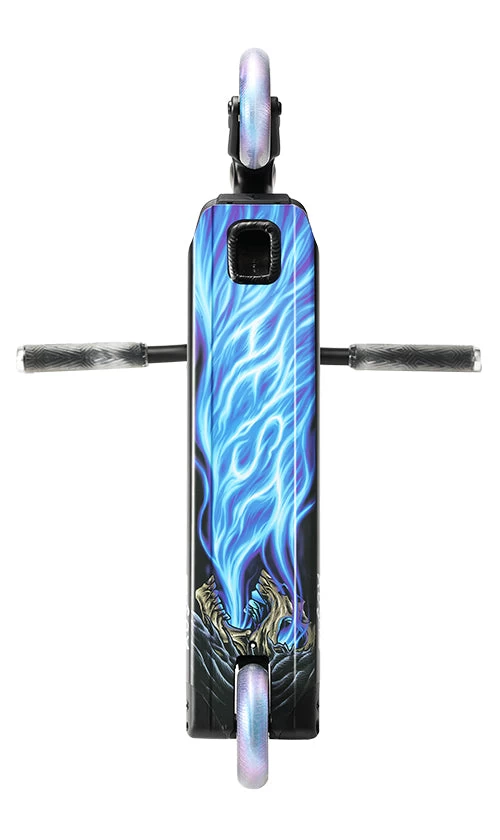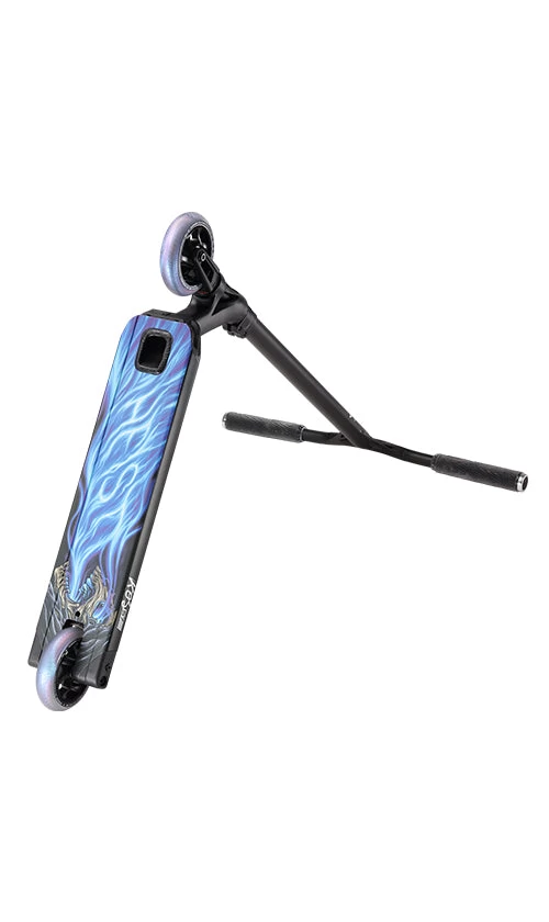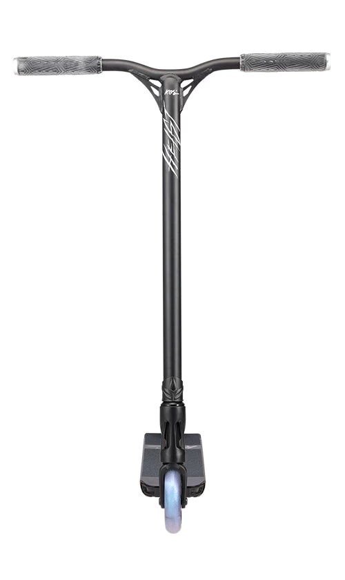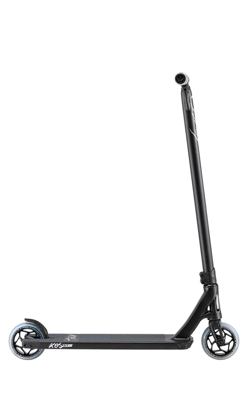 The NEW KOS Heist features include: Aluminium Reaper V2 Bars-light weight and durable construction means superb aerodynamics that can take a beating; Clear/Chrome Will Scott Signature Handgrips–extremely durable and offer the perfect grip for the scooter with added bar protection with the Halo bar ends; The original 2 bolt Forged clamp raised front profile adds classic style and light weight protection for the Reaper Bar; Declare IHC compression Forks-a perfect fit for the30mm wheels; 30mm wide Tri-Bearing wheels with Galaxy PU give a seriously smooth and responsive ride; AOSV4 X KOS 6061-t6 extruded Aluminium deck; and Integrated head tube at 84 degrees fitted with Boxed ends. By utilising the AOSv4 signature headtube combined with the KOS headtube cut-out, this calls for one fine looking deck profile. This ever-classic stunt scooter is finished off with Boxed ends, a nylon brake system, nylon front plate, and rear inserts.