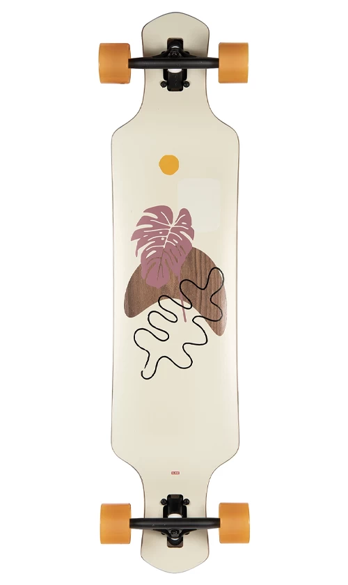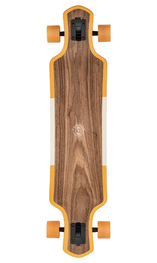 Symmetrical, rockered, cut away longboard with drop-through trucks. Theย Geminon 40 Rock inย Walnut/Monstera features walnut + hard rock maple deck construction with front to back rocker and very subtle W side to side concave. Includesย 180mm Slant reverse kingpin trucks andย 70mm 83a conical cruiser wheels.ย Clear broadcast grip.