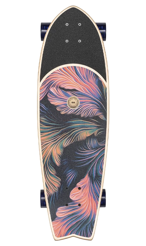 The Sun City in Coral Unity is a mid-sized, surf-inspired swallow tail cruiser with deck and grip tapeย artwork by featured artist Sam Chirnside. With a mellow concave and kicktail, the deckย is constructed from Resin-7 hard rock maple and features an embedded metal badge detail. Featuring 5.25″ Tensor alloy trucks and 62mm 78a wheels.ย ย