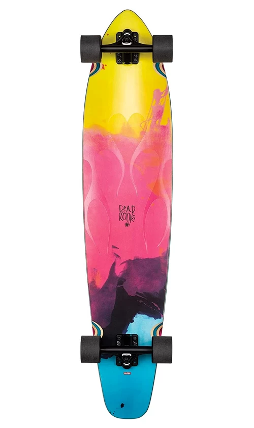 The Byron Bay Dead Kooks is a surf-inspired, resin-8 hard rock maple longboard. Featuring mellow concave with kick tail and 150mm Slant reverse kingpin trucks. Also features 70mm 78a wheels, black grip tape with print and raised glossy flames.