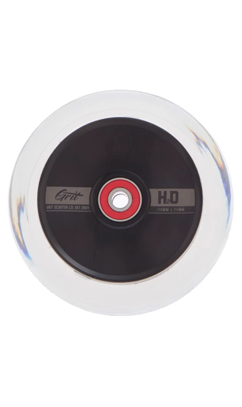 Grit Scooters brings the clear urethane back into style with the new lightweight H2O hollow core wheels! The Grit H2O Hollow Core Scooter Wheels 110mm in Clear/Blackย come in pairs and are standard with ABEC 9 bearings for a smooth ride.