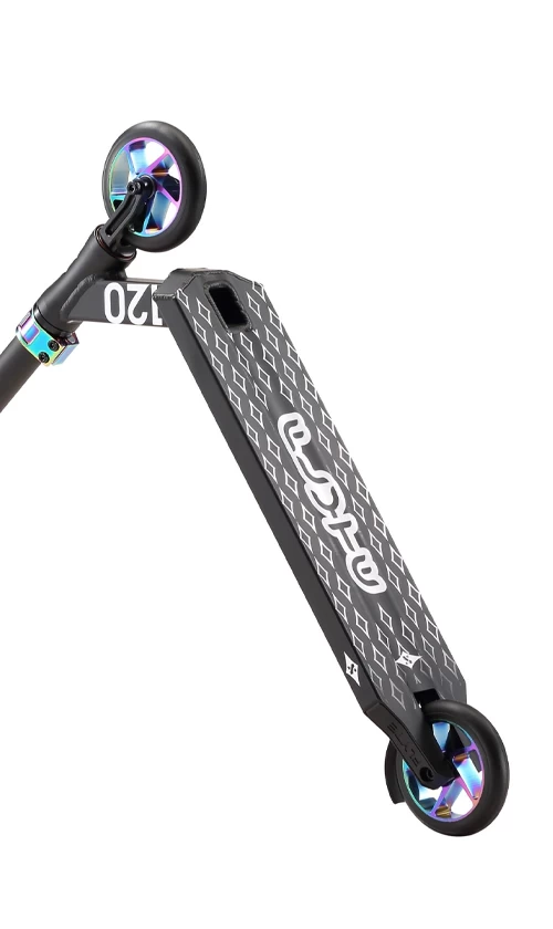 The demand for improving Scooters to be lighter, faster and durable is one that Sacrifice V3 Flyte 120 scooter has met. The Flyte 120 deck is 120mm wide and has variable wall thickness extrusions to maximise strength while minimising weight.ย
