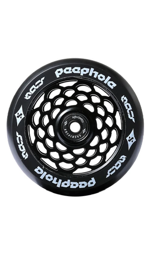 Sacrifice Scooters has always lead the scooter industry with unique designs, the new Spy Peephole wheel is a perfect example of that. We have used the past 20 months developing the new Spy Peephole wheels and taking important information from our very popular Spy wheel on how we can improve the Spy wheel technology making it faster and lighter. The attention to detail is really amazing as we have focused on design, strength, reliability and the best value for money wheel out there. The cut outs in the Peephole wheel reduce un wanted weight why not jeopardizing the strength needed.